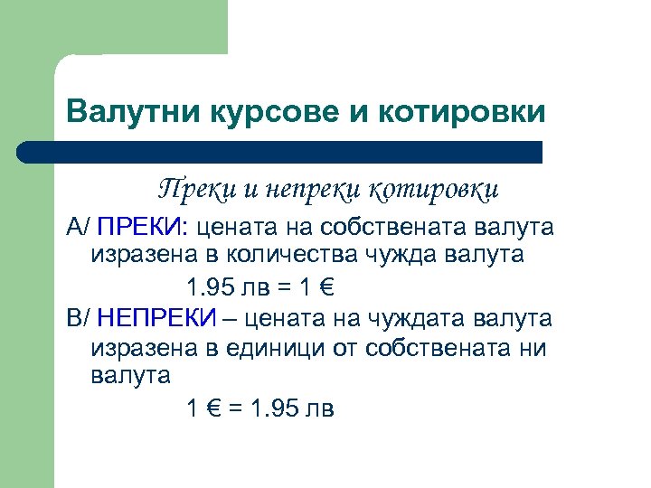 Валутни курсове и котировки Преки и непреки котировки A/ ПРЕКИ: цената на собствената валута изразена в количества чужда валута 1. 95 лв = 1 € B/ НЕПРЕКИ – цената на чуждата валута изразена в единици от собствената ни валута 1 € = 1. 95 лв