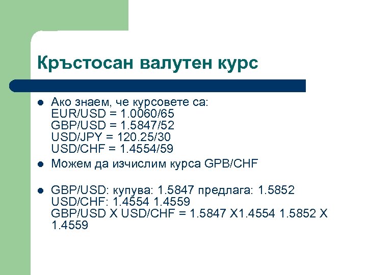 Кръстосан валутен курс l l l Ако знаем, че курсовете са: EUR/USD = 1. 0060/65 GBP/USD = 1. 5847/52 USD/JPY = 120. 25/30 USD/CHF = 1. 4554/59 Можем да изчислим курса GPB/CHF GBP/USD: купува: 1. 5847 предлага: 1. 5852 USD/CHF: 1. 4554 1. 4559 GBP/USD X USD/CHF = 1. 5847 X 1. 4554 1. 5852 X 1. 4559