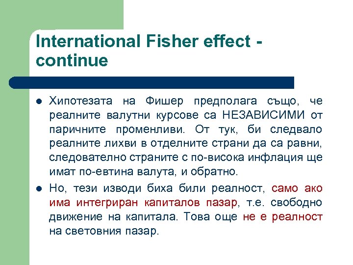 International Fisher effect continue l l Хипотезата на Фишер предполага също, че реалните валутни курсове са НЕЗАВИСИМИ от паричните променливи. От тук, би следвало реалните лихви в отделните страни да са равни, следователно страните с по-висока инфлация ще имат по-евтина валута, и обратно. Но, тези изводи биха били реалност, само ако има интегриран капиталов пазар, т. е. свободно движение на капитала. Това още не е реалност на световния пазар.