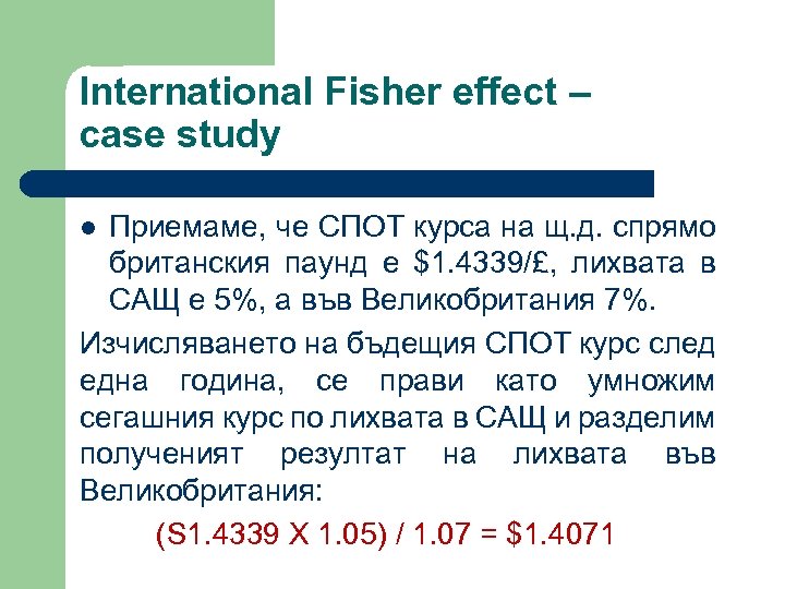 International Fisher effect – case study Приемаме, че СПОТ курса на щ. д. спрямо британския паунд е $1. 4339/£, лихвата в САЩ е 5%, а във Великобритания 7%. Изчисляването на бъдещия СПОТ курс след една година, се прави като умножим сегашния курс по лихвата в САЩ и разделим полученият резултат на лихвата във Великобритания: (S 1. 4339 X 1. 05) / 1. 07 = $1. 4071 l