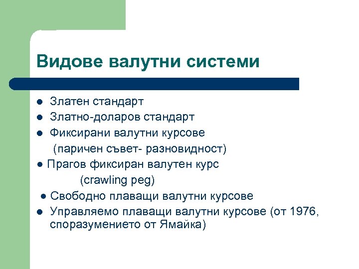 Видове валутни системи Златен стандарт l Златно-доларов стандарт l Фиксирани валутни курсове (паричен съвет- разновидност) ● Прагов фиксиран валутен курс (crawling peg) ● Свободно плаващи валутни курсове l Управляемо плаващи валутни курсове (от 1976, споразумението от Ямайка) l