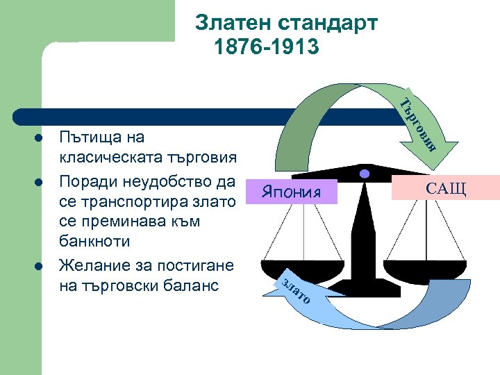 Златен стандарт 1876 -1913 р Тъ l я ви l Пътища на класическата търговия Поради неудобство да се транспортира злато се преминава към банкноти Желание за постигане на търговски баланс го l Япония зл ат о САЩ
