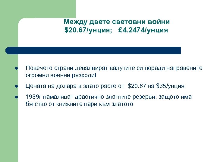 Между двете световни войни $20. 67/унция; £ 4. 2474/унция l Повечето страни девалвират валутите си поради направените огромни военни разходиt l Цената на долара в злато расте от $20. 67 на $35/унция l 1939 г намаляват драстично златните резерви, защото има бягство от книжните пари към златото