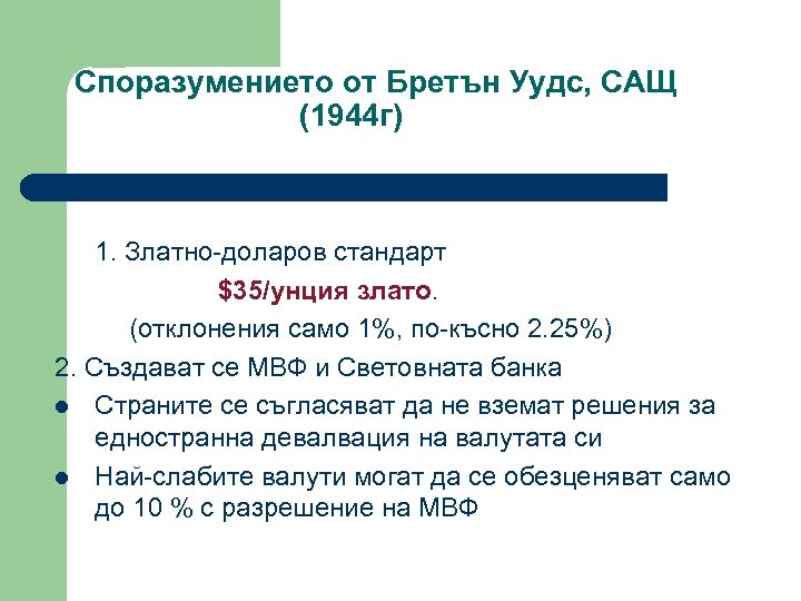 Споразумението от Бретън Уудс, САЩ (1944 г) 1. Златно-доларов стандарт $35/унция злато. (отклонения само 1%, по-късно 2. 25%) 2. Създават се МВФ и Световната банка l Страните се съгласяват да не вземат решения за едностранна девалвация на валутата си l Най-слабите валути могат да се обезценяват само до 10 % с разрешение на МВФ