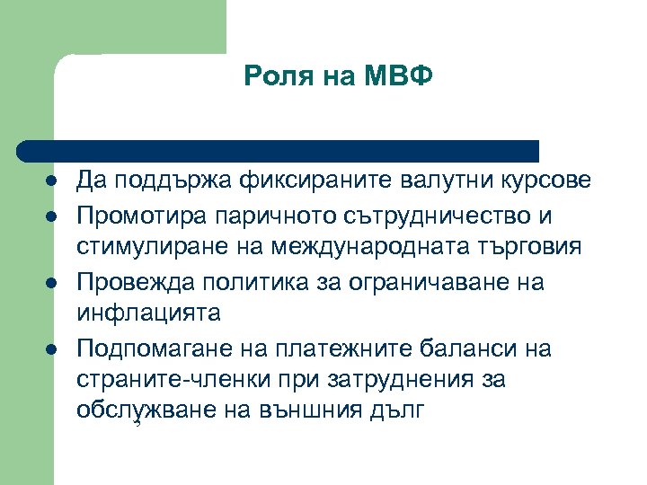 Роля на МВФ l l Да поддържа фиксираните валутни курсове Промотира паричното сътрудничество и стимулиране на международната търговия Провежда политика за ограничаване на инфлацията Подпомагане на платежните баланси на страните-членки при затруднения за обслужване на външния дълг ,