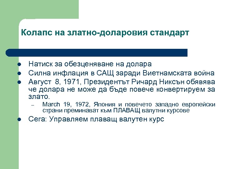 Колапс на златно-доларовия стандарт l l l Натиск за обезценяване на долара Силна инфлация в САЩ заради Виетнамската война Август 8, 1971, Президентът Ричард Никсън обявява че долара не може да бъде повече конвертируем за злато. – l March 19, 1972, Япония и повечето западно европейски страни преминават към ПЛАВАЩ валутни курсове Сега: Управляем плаващ валутен курс
