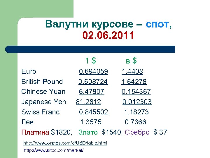 Валутни курсове – спот, 02. 06. 2011 1 $ в $ Euro 0. 694059 1. 4408 British Pound 0. 608724 1. 64278 Chinese Yuan 6. 47807 0. 154367 Japanese Yen 81. 2812 0. 012303 Swiss Franc 0. 845502 1. 18273 Лев 1. 3575 0. 7366 Платина $1820, Злато $1540, Сребро $ 37 http: //www. x-rates. com/d/USD/table. html http: //www. kitco. com/market/
