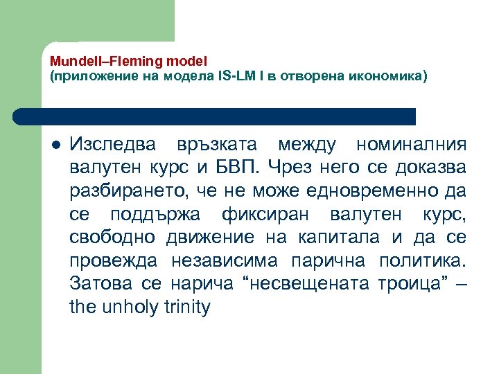 Mundell–Fleming model (приложение на модела IS-LM l в отворена икономика) l Изследва връзката между номиналния валутен курс и БВП. Чрез него се доказва разбирането, че не може едновременно да се поддържа фиксиран валутен курс, свободно движение на капитала и да се провежда независима парична политика. Затова се нарича “несвещената троица” – the unholy trinity