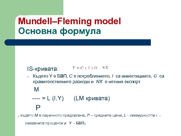 Mundell–Fleming model Основна формула IS-кривата: – Където Y е БВП, C е потреблението, I са инвестициите, G са правителствените разходи и NX е нетния експорт M ---- = L (I, Y) (LM кривата) P , където M е паричното предлагане, P – средните цени, L - ликвидността i - лихвените проценти и Y - БВП .