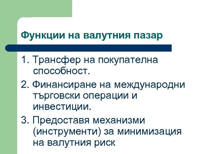 Функции на валутния пазар 1. Трансфер на покупателна способност. 2. Финансиране на международни търговски операции и инвестиции. 3. Предоставя механизми (инструменти) за минимизация на валутния риск