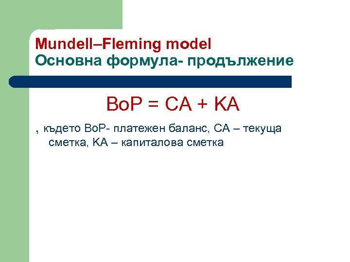 Mundell–Fleming model Основна формула- продължение Bo. P = CA + KA , където Bo. P- платежен баланс, CA – текуща сметка, KA – капиталова сметка