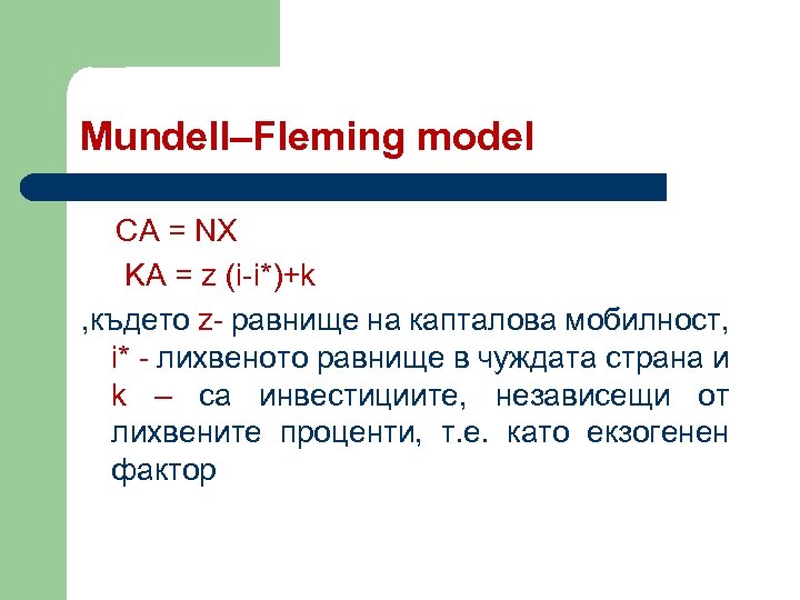 Mundell–Fleming model CA = NX KA = z (i-i*)+k , където z- равнище на капталова мобилност, i* - лихвеното равнище в чуждата страна и k – са инвестициите, независещи от лихвените проценти, т. е. като екзогенен фактор