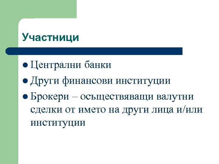 Участници l Централни банки l Други финансови институции l Брокери – осъществяващи валутни сделки от името на други лица и/или институции