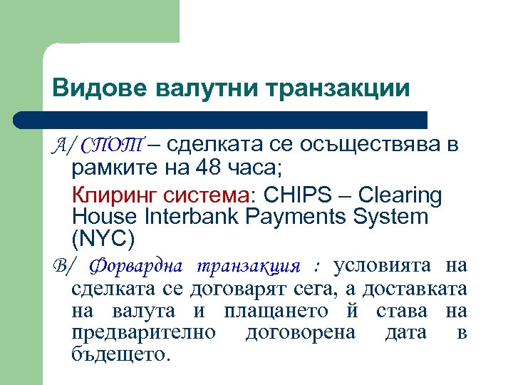 Видове валутни транзакции A/ СПОТ – сделката се осъществява в рамките на 48 часа; Клиринг система: CHIPS – Clearing House Interbank Payments System (NYC) B/ Форвардна транзакция : условията на сделката се договарят сега, а доставката на валута и плащането й става на предварително договорена дата в бъдещето.