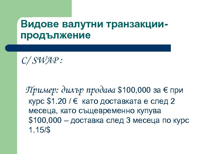 Видове валутни транзакциипродължение C/ SWAP : Пример: дилър продава $100, 000 за € при курс $1. 20 / € като доставката е след 2 месеца, като същевременно купува $100, 000 – доставка след 3 месеца по курс 1. 15/$