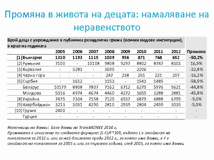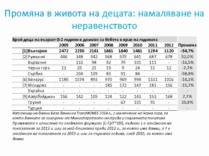 Промяна в живота на децата: намаляване на неравенството Брой деца на възраст 0 -2 години в домове за бебета в края на годината 2005 2006 2007 2008 2009 2010 2011 [1]България 2472 2250 2161 1840 1481 1294 [2]Румъния 446 348 542 568 575 641 687 Хърватия 133 98 92 79 101 111 Черна гора 13 25 21 19 9 24 11 Сърбия 204 109 83 51 84 [6]Беларус 1185 1074 893 970 969 994 1331 [7]Молдова 185 172 147 181 Украйна [9]Азербайджан 156 142 105 124 122 143 153 Грузия 67 101 91 Турция - 2012 Промяна 1120 -54, 7% 678 52, 0% -16, 5% 12 -7, 7% -58, 8% 1016 -14, 3% 156 -15, 7% 168 7, 7% 35, 8% - Източници на данни: База данни на Trans. MONEE 2014 г. , с изключение на Черна гора, за която данните са осигурени от Министерството на труда и социалната политика Промяната е изчислена по следната формула: (L-F)/F*100, където L е стойност на показателя за 2012 г. или за най-близката преди 2012 г. , за която има данни, а F е стойност на показателя за 2005 г. или за първата година, след 2005, за която има данни