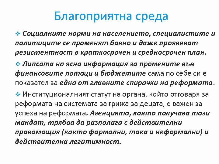 Благоприятна среда v Социалните норми на населението, специалистите и политиците се променят бавно и даже проявяват резистентност в краткосрочен и средносрочен план. v Липсата на ясна информация за промените във финансовите потоци и бюджетите сама по себе си е показател за една от главните спирачки на реформата. v Институционалният статут на органа, който отговаря за реформата на системата за грижа за децата, е важен за успеха на реформата. Агенцията, която получава този мандат, трябва да разполага с действителни правомощия (както формални, така и неформални) и действителна легитимност.