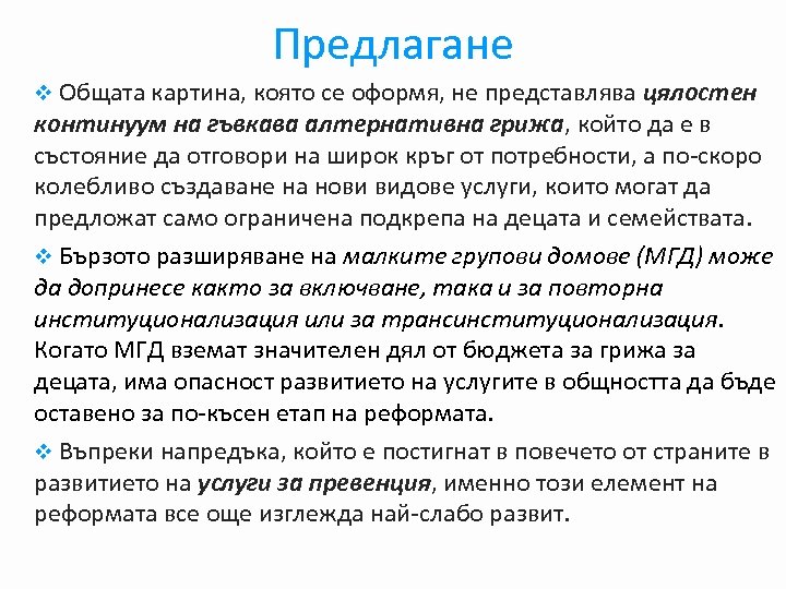 Предлагане v Общата картина, която се оформя, не представлява цялостен континуум на гъвкава алтернативна грижа, който да е в състояние да отговори на широк кръг от потребности, а по-скоро колебливо създаване на нови видове услуги, които могат да предложат само ограничена подкрепа на децата и семействата. v Бързото разширяване на малките групови домове (МГД) може да допринесе както за включване, така и за повторна институционализация или за трансинституционализация. Когато МГД вземат значителен дял от бюджета за грижа за децата, има опасност развитието на услугите в общността да бъде оставено за по-късен етап на реформата. v Въпреки напредъка, който е постигнат в повечето от страните в развитието на услуги за превенция, именно този елемент на реформата все още изглежда най-слабо развит.