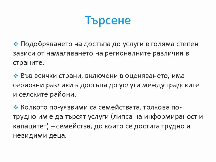 Търсене v Подобряването на достъпа до услуги в голяма степен зависи от намаляването на регионалните различия в страните. v Във всички страни, включени в оценяването, има сериозни разлики в достъпа до услуги между градските и селските райони. v Колкото по-уязвими са семействата, толкова по- трудно им е да търсят услуги (липса на информираност и капацитет) – семейства, до които се достига трудно и невидими деца.