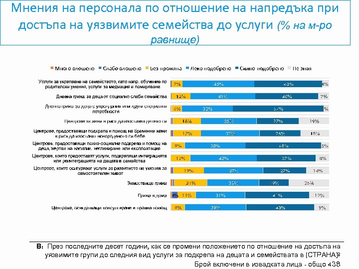 Мнения на персонала по отношение на напредъка при достъпа на уязвимите семейства до услуги (% на м-ро равнище) В: През последните десет години, как се промени положението по отношение на достъпа на уязвимите групи до следния вид услуги за подкрепа на децата и семействата в [СТРАНА]? Брой включени в извадката лица - общо 438