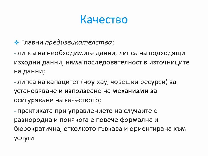 Качество v Главни предизвикателства: - липса на необходимите данни, липса на подходящи изходни данни, няма последователност в източниците на данни; - липса на капацитет (ноу-хау, човешки ресурси) за установяване и използване на механизми за осигуряване на качеството; - практиката при управлението на случаите е разнородна и понякога е повече формална и бюрократична, отколкото гъвкава и ориентирана към услуги