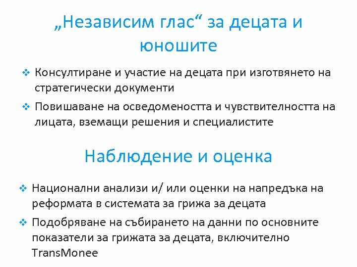 „Независим глас“ за децата и юношите Консултиране и участие на децата при изготвянето на стратегически документи v Повишаване на осведомеността и чувствителността на лицата, вземащи решения и специалистите v Наблюдение и оценка Национални анализи и/ или оценки на напредъка на реформата в системата за грижа за децата v Подобряване на събирането на данни по основните показатели за грижата за децата, включително Trans. Monee v