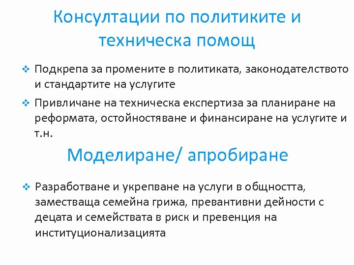 Консултации по политиките и техническа помощ Подкрепа за промените в политиката, законодателството и стандартите на услугите v Привличане на техническа експертиза за планиране на реформата, остойностяване и финансиране на услугите и т. н. v Моделиране/ апробиране v Разработване и укрепване на услуги в общността, заместваща семейна грижа, превантивни дейности с децата и семействата в риск и превенция на институционализацията