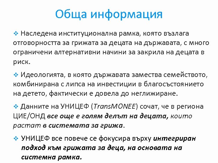 Обща информация v Наследена институционална рамка, която възлага отговорността за грижата за децата на държавата, с много ограничени алтернативни начини за закрила на децата в риск. v Идеологията, в която държавата замества семейството, комбинирана с липса на инвестиции в благосъстоянието на детето, фактически е довела до неглижиране. v Данните на УНИЦЕФ (Trans. MONEE) сочат, че в региона ЦИЕ/ОНД все още е голям делът на децата, които растат в системата за грижа. v УНИЦЕФ все повече се фокусира върху интегриран подход към грижата за деца, на основата на системна рамка.