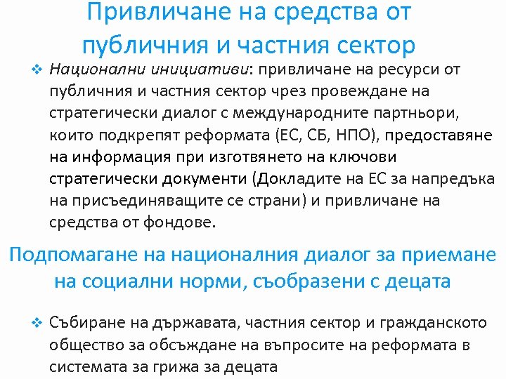 v Привличане на средства от публичния и частния сектор Национални инициативи: привличане на ресурси от публичния и частния сектор чрез провеждане на стратегически диалог с международните партньори, които подкрепят реформата (ЕС, СБ, НПО), предоставяне на информация при изготвянето на ключови стратегически документи (Докладите на ЕС за напредъка на присъединяващите се страни) и привличане на средства от фондове. Подпомагане на националния диалог за приемане на социални норми, съобразени с децата v Събиране на държавата, частния сектор и гражданското общество за обсъждане на въпросите на реформата в системата за грижа за децата