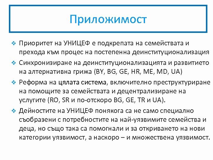 Приложимост Приоритет на УНИЦЕФ е подкрепата на семействата и прехода към процес на постепенна деинституционализация v Синхронизиране на деинституционализацията и развитието на алтернативна грижа (BY, BG, GE, HR, ME, MD, UA) v Реформа на цялата система, включително преструктуриране на помощите за семействата и децентрализиране на услугите (RO, SR и по-отскоро BG, GE, TR и UA). v Дейностите на УНИЦЕФ понякога са не само специално съобразени с потребностите на най-уязвимите семейства и деца, но също така са помогнали и за откриването на нови категории уязвимост, а наскоро – и множествена уязвимост. v