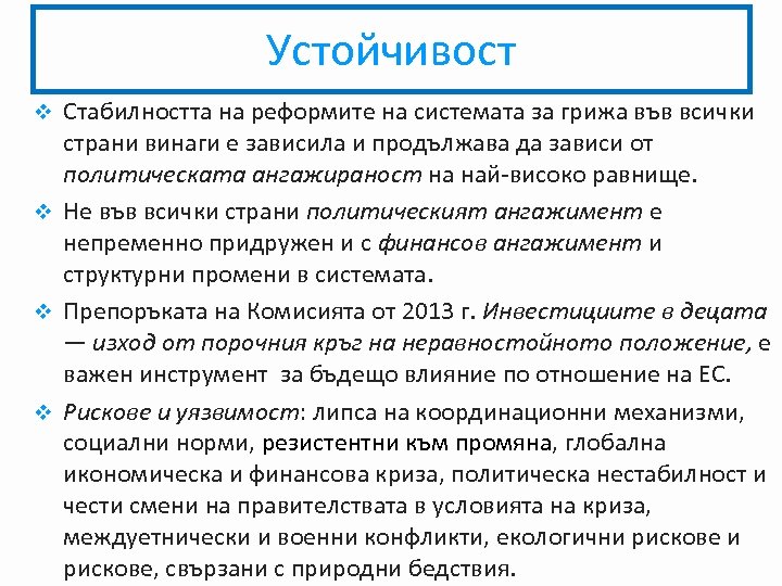 Устойчивост Стабилността на реформите на системата за грижа във всички страни винаги е зависила и продължава да зависи от политическата ангажираност на най-високо равнище. v Не във всички страни политическият ангажимент е непременно придружен и с финансов ангажимент и структурни промени в системата. v Препоръката на Комисията от 2013 г. Инвестициите в децата — изход от порочния кръг на неравностойното положение, е важен инструмент за бъдещо влияние по отношение на ЕС. v Рискове и уязвимост: липса на координационни механизми, социални норми, резистентни към промяна, глобална икономическа и финансова криза, политическа нестабилност и чести смени на правителствата в условията на криза, междуетнически и военни конфликти, екологични рискове, свързани с природни бедствия. v