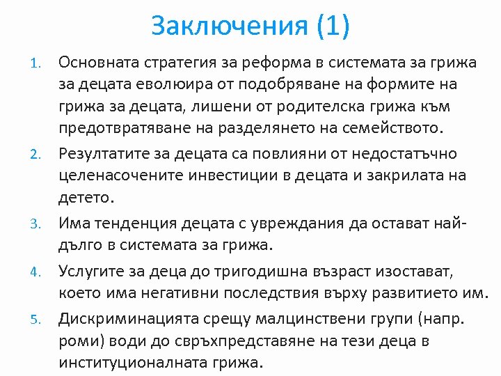 Заключения (1) 1. 2. 3. 4. 5. Основната стратегия за реформа в системата за грижа за децата еволюира от подобряване на формите на грижа за децата, лишени от родителска грижа към предотвратяване на разделянето на семейството. Резултатите за децата са повлияни от недостатъчно целенасочените инвестиции в децата и закрилата на детето. Има тенденция децата с увреждания да остават найдълго в системата за грижа. Услугите за деца до тригодишна възраст изостават, което има негативни последствия върху развитието им. Дискриминацията срещу малцинствени групи (напр. роми) води до свръхпредставяне на тези деца в институционалната грижа.