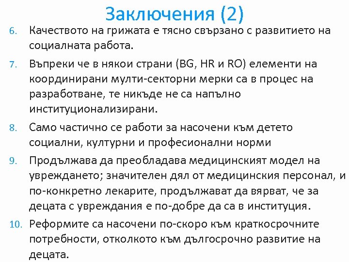 6. 7. 8. 9. 10. Заключения (2) Качеството на грижата е тясно свързано с развитието на социалната работа. Въпреки че в някои страни (BG, HR и RO) елементи на координирани мулти-секторни мерки са в процес на разработване, те никъде не са напълно институционализирани. Само частично се работи за насочени към детето социални, културни и професионални норми Продължава да преобладава медицинският модел на увреждането; значителен дял от медицинския персонал, и по-конкретно лекарите, продължават да вярват, че за децата с увреждания е по-добре да са в институция. Реформите са насочени по-скоро към краткосрочните потребности, отколкото към дългосрочно развитие на децата.