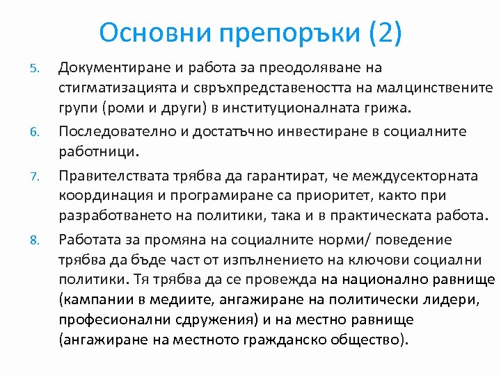 Основни препоръки (2) 5. 6. 7. 8. Документиране и работа за преодоляване на стигматизацията и свръхпредставеността на малцинствените групи (роми и други) в институционалната грижа. Последователно и достатъчно инвестиране в социалните работници. Правителствата трябва да гарантират, че междусекторната координация и програмиране са приоритет, както при разработването на политики, така и в практическата работа. Работата за промяна на социалните норми/ поведение трябва да бъде част от изпълнението на ключови социални политики. Тя трябва да се провежда на национално равнище (кампании в медиите, ангажиране на политически лидери, професионални сдружения) и на местно равнище (ангажиране на местното гражданско общество).