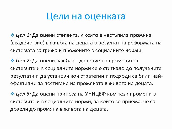 Цели на оценката v Цел 1: Да оцени степента, в която е настъпила промяна (въздействие) в живота на децата в резултат на реформата на системата за грижа и промените в социалните норми. v Цел 2: Да оцени как благодарение на промените в системите и в социалните норми се е стигнало до получените резултати и да установи кои стратегии и подходи са били найефективни за постигане на промяната в живота на децата. v Цел 3: Да оцени приноса на УНИЦЕФ към тези промени в системите и в социалните норми, за които се приема, че са довели до промяна в живота на децата.