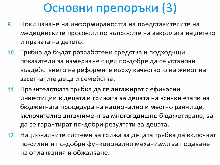 Основни препоръки (3) Повишаване на информираността на представителите на медицинските професии по въпросите на закрилата на детето и правата на детето. 10. Трябва да бъдат разработени средства и подходящи показатели за измерване с цел по-добре да се установи въздействието на реформите върху качеството на живот на засегнатите деца и семейства. 11. Правителствата трябва да се ангажират с ефикасни инвестиции в децата и грижата за децата на всички етапи на бюджетната процедура на национално и местно равнище, включително ангажимент за многогодишно бюджетиране, за да се гарантират по-добри резултати за децата. 12. Националните системи за грижа за децата трябва да включват по-силни и по-добри функционални механизми за подаване на оплаквания и обжалване. 9.