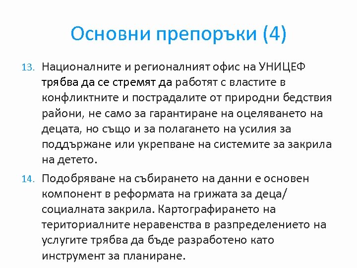 Основни препоръки (4) Националните и регионалният офис на УНИЦЕФ трябва да се стремят да работят с властите в конфликтните и пострадалите от природни бедствия райони, не само за гарантиране на оцеляването на децата, но също и за полагането на усилия за поддържане или укрепване на системите за закрила на детето. 14. Подобряване на събирането на данни е основен компонент в реформата на грижата за деца/ социалната закрила. Картографирането на териториалните неравенства в разпределението на услугите трябва да бъде разработено като инструмент за планиране. 13.