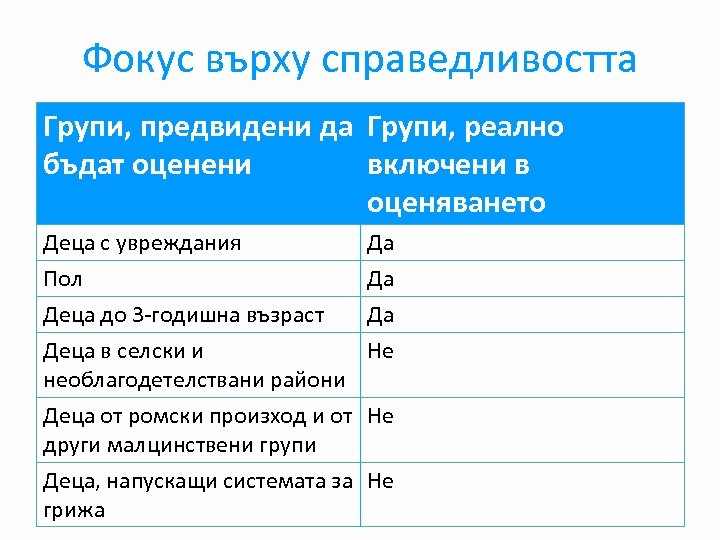 Фокус върху справедливостта Групи, предвидени да Групи, реално бъдат оценени включени в оценяването Деца с увреждания Да Пол Да Деца до 3 -годишна възраст Да Деца в селски и Не необлагодетелствани райони Деца от ромски произход и от Не други малцинствени групи Деца, напускащи системата за Не грижа