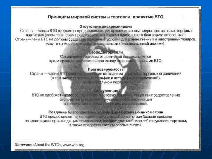 Основные принципы ГАТТ 1 принцип - «режим наибольшего благоприятствования» n необходимость соблюдения равенства и недискриминации всех участников внешней торговли. n обязательство стран-участниц устанавливать на взаимно поставляемые товары пошлины не выше тех, которые были установлены по отношению к любой третьей стороне n допускаются исключения в случаях создания специальных экономических (интеграционных) группировок (ЕС, ЕАСТ, НАФТА, МЕРКОСУР и др. ) n предоставление развивающимся странам права пользоваться преференциальным таможенным режимом на односторонней основе, то есть без взаимного снижения пошлин на товары, импортируемые из развитых стран. 2 принцип - правомочность форм регулирования внешней торговли. n ГАТТ признает пошлины в качестве единственного приемлемого средства. n Все остальные формы и методы применяться не должны, а в тех случаях, когда их применение и осуществляется, это должно носить временный характер и обосновываться исключительными обстоятельствами. n ГАТТ не рекомендует странам-участницам использовать квоты, а также экспортные или импортные лицензии