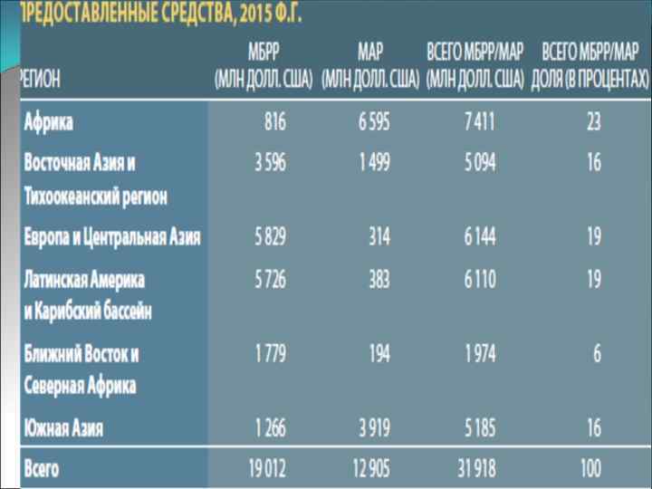 Основные цели деятельности МБРР согласно уставу: 1 2 3 • оказание помощи в реконструкции и развитии экономик стран-членов путем поощрения капиталовложений на производственные цели • поощрение частных и иностранных инвестиций посредством предоставления гарантий или участия в займах и инвестициях частных кредиторов • содействие перспективному сбалансированному росту международной торговли и поддержание равновесия платежных балансов путем инвестиций в развитие производственных ресурсов