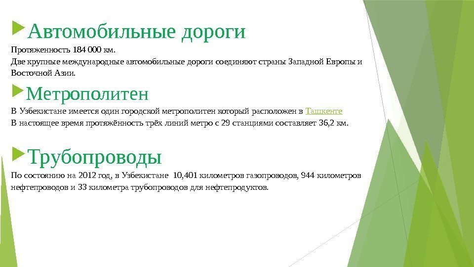 Автомобильные дороги Протяженность 184 000 км. Две крупные международные автомобильные дороги соединяют страны Западной Европы и Восточной Азии. Метрополитен В Узбекистане имеется один городской метрополитен который расположен в Ташкенте В настоящее время протяжённость трёх линий метро с 29 станциями составляет 36, 2 км. Трубопроводы По состоянию на 2012 год, в Узбекистане 10, 401 километров газопроводов, 944 километров нефтепроводов и 33 километра трубопроводов для нефтепродуктов.