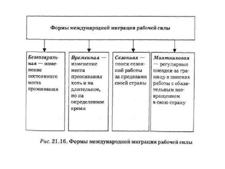 • В мировой практике в настоящее время сформировалась определенная классификация форм миграции рабочей силы. Они состоят в следующем: • 1) по направлениям: • а) миграция из развивающихся и постсоциалистических стран в промышленно развитые; • б) миграция в рамках промышленно развитых стран; • в) миграция рабочей силы между развивающимися странами; • г) миграция высококвалифицированной рабочей силы из промышленно развитых в развивающиеся страны; • 2) по территориальному охвату: • а) межконтинентальная; • б) внутриконтинентальная; • 3) по уровню квалификации мигрантов: • а) высококвалифицированная рабочая сила; • б) низкоквалифицированная рабочая сила; • 4) по времени: • а) безвозвратная (как правило, межконтинентальная); • б) временная (как правило, внутриконтинентальная); • в) сезонная (связанная с ежегодными поездками на заработки); • г) маятниковая (предусматривающая ежедневные поездки к месту работы за пределы своего населенного пункта, страны); • 5) по степени законности: • а) легальная; • б) нелегальная.