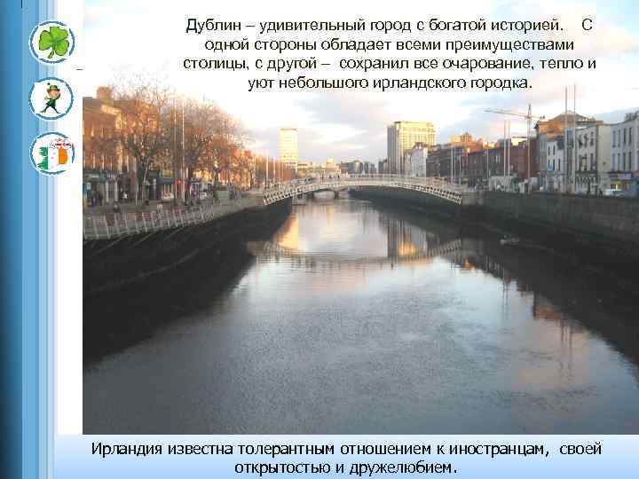Дублин – удивительный город с богатой историей. С одной стороны обладает всеми преимуществами столицы, с другой – сохранил все очарование, тепло и уют небольшого ирландского городка. Ирландия известна толерантным отношением к иностранцам, своей открытостью и дружелюбием. 2
