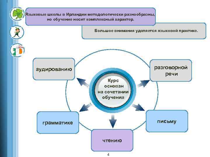 Языковые школы в Ирландии методологически разнообразны, но обучение носит комплексный характер. Большое внимания уделяется языковой практике. разговорной речи аудированию Курс основан на сочетании обучения письму грамматике чтению 4