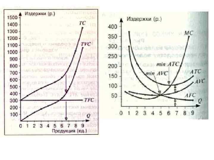 Выпус Издержки, ден. ед к Предельн Средние продук Общие ые постоянные переменны общие ции постоянные переменны (TC=TVC (MC=∆TC (AFC=TFC/ е (AVC= (ATC=AFC (шт. ) (TFC) е (TVC) +TFC) /∆Q) Q) TVC/Q) +AVC) Q 0 300 70 — — — 1 300 70 370 60 300 70 370 2 300 130 430 50 150 65 215 3 300 180 40 100 60 160 4 300 220 50 75 55 130 5 300 270 570 60 60 54 114 6 300 330 630 180 55 50 105 7 300 510 810 200 43 73 116 8 300 710 1010 350 38 89 126 9 300 1060 1360 33 118 151