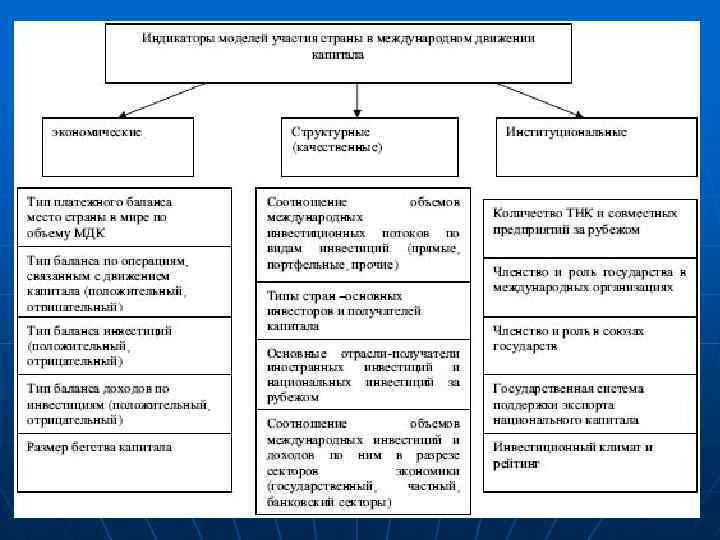 Цели вывоза капитала n n n Наличие в странах, куда экспортируется капитал, более дешевого сырья и рабочей силы. Благоприятный инвестиционный климат. Наличие возможности монополизации местного рынка. Различия в уровне издержек производства. Близость к потребителям. Возможность преодоления торговых барьеров.