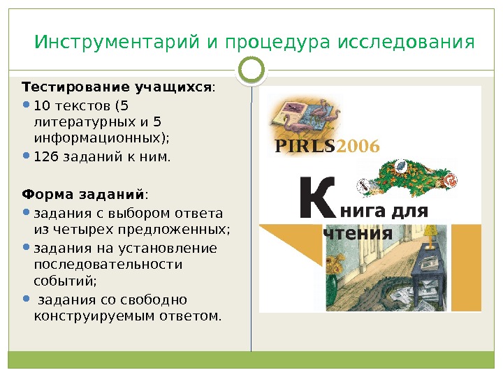 Инструментарий и процедура исследования В исследовании оценивались два вида чтения : — чтение с целью приобретения читательского литературного опыта; чтение с целью освоения и использования информации. Оцениваются четыре группы читательских умений : — нахождение информации, заданной в явном виде; — формулирование выводов; — интерпретация и обобщение информации; — анализ и оценка содержания, языковых особенностей и структуры текста.