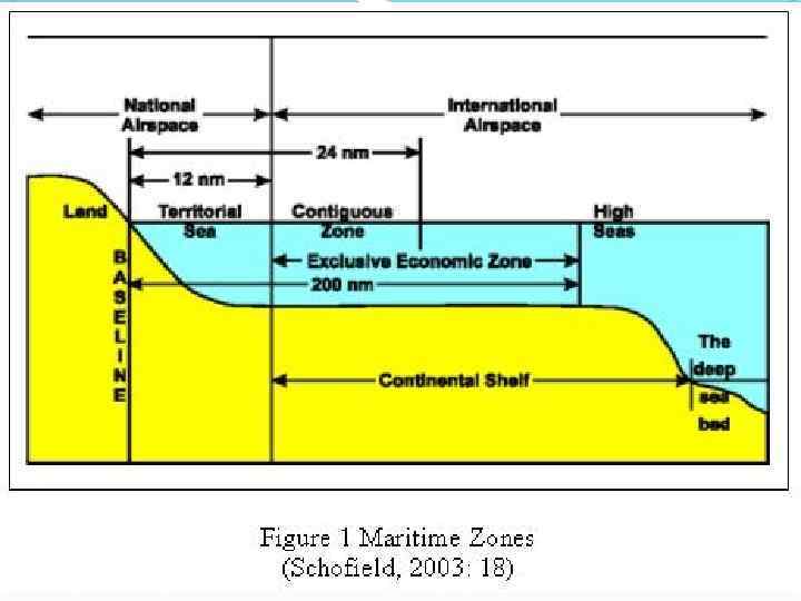 Континентальный шельф Ширина: 1) 2) 3) = 200 мор. /м. до 350 мор. /м. до 100 мор. /м. от изобаты в 2500 метров. Статус: Прибрежное гос-во: исключительные права на разведку и разработку природных ресурсов. Другие гос-ва: право прокладывать трубопроводы, кабели.