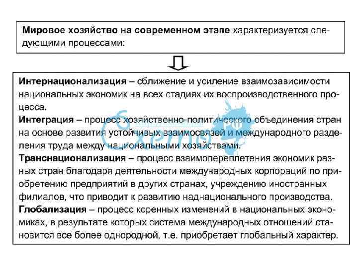 Транснационализация появление разветвленных многоотраслевых комплексов в международном масштабе, размывание экономических границ между государствами в результате действия транснациональных корпораций (ТНК). Возникает качественно новый момент интернационализации – взаимодействия и взаимопереплетения национальных экономик.