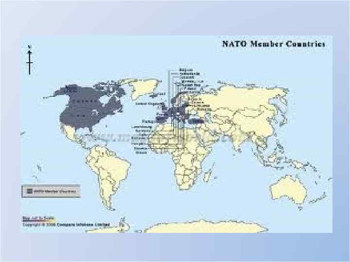 6. Организация Североатлантического договора (НАТО) Североатлантический пакт от 4 апреля 1949 г. Основные органы: 1. Совет НАТО 2. Комитет военного планирования 3. Военный комитет 4. Секретариат
